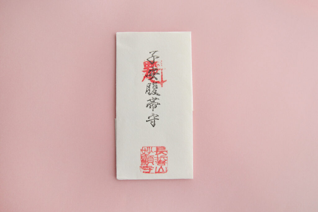 授与品の「子安腹帯守」は、妙顕寺で古くから代々受け継がれてきたもので、ひとつひとつ僧侶が一つひとつ手作業で制作しております。妊婦様のお名前と祈祷日をお書き入れします。